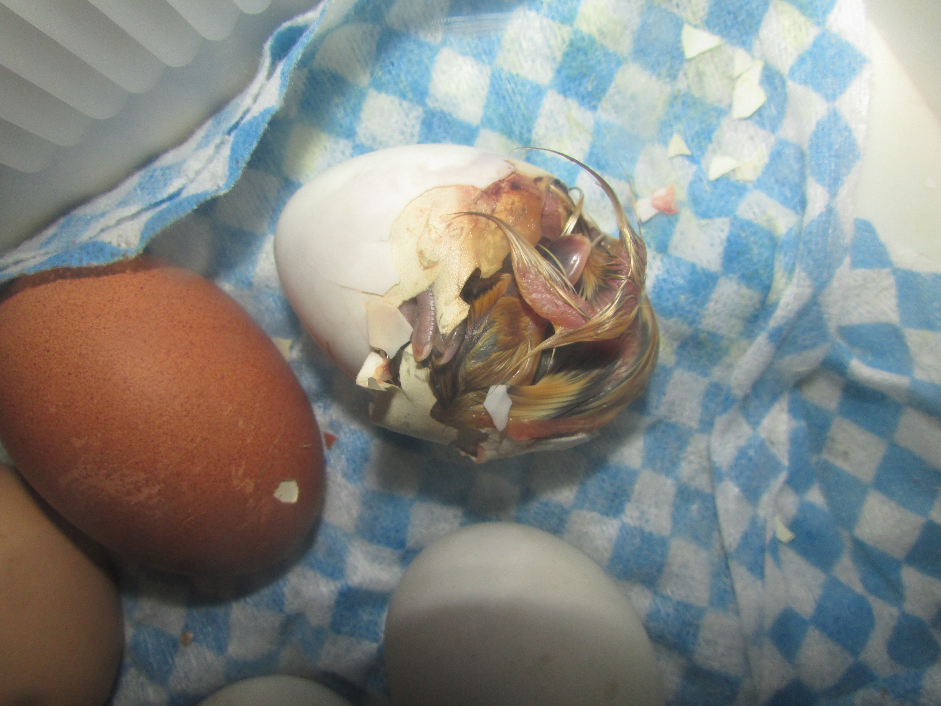 Once it has got enough strength (from absorbing the yolk) it will hatch the rest of the way itself. Obviously this is rather time consuming, so do not begin to ‘help’ (or interfere as my children put it) unless you have alot of time and do not mind a bit of gore (there are a lot of capillaries around the shell and yolk, so expect a bit of blood. It does not seem to come from the bird, which is usually fine, but it looks a bit unpleasant.) When the bird has fully hatched, leave it in the incubator for about 12 hours. It will rest (and look like it has died) for a few hours, then will dry out and start bouncing around.