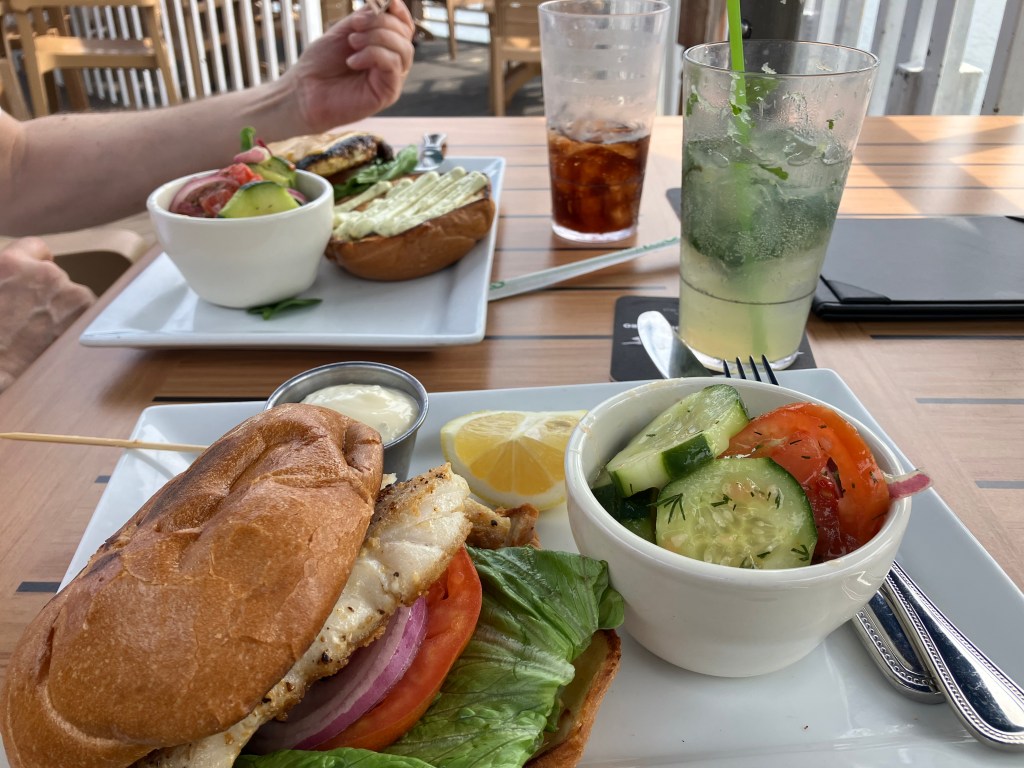 We went shopping for shoes. Not a usual thing for us to do, but Husband’s trainers are falling to bits. We found an excellent shop, with an excellent assistant, and bought two pairs in the sales. Then we looked for a bagel shop, because I hankered for a cinnamon bagel that I could eat outside, somewhere pretty. We failed on this one, though as we wandered around the docks area we did see lots of pretty places. Returned to Fresco’s Waterfront Bistro for an early lunch. I had a fish burger (again) which was nice (would have been nicer if I actually liked fish, which I don’t much, but I am trying to not eat meat). It was a pretty place to sit, right on the water, with flags and lights and blue umbrellas to shade us from the sun.