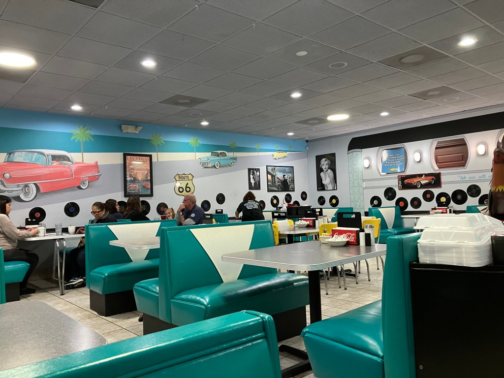 We stopped for lunch at a diner Husband found online. It looked a bit seedy as we approached, but inside was magnificent. Egg City is a 50’s diner, and the turquoise and white decor was full of memorabilia— juke boxes and records and shiny lights. The washrooms were labelled eggs or sausages which made me laugh! I ate pancakes, which of course were much too much, so I took the leftovers with me in a polystyrene box.