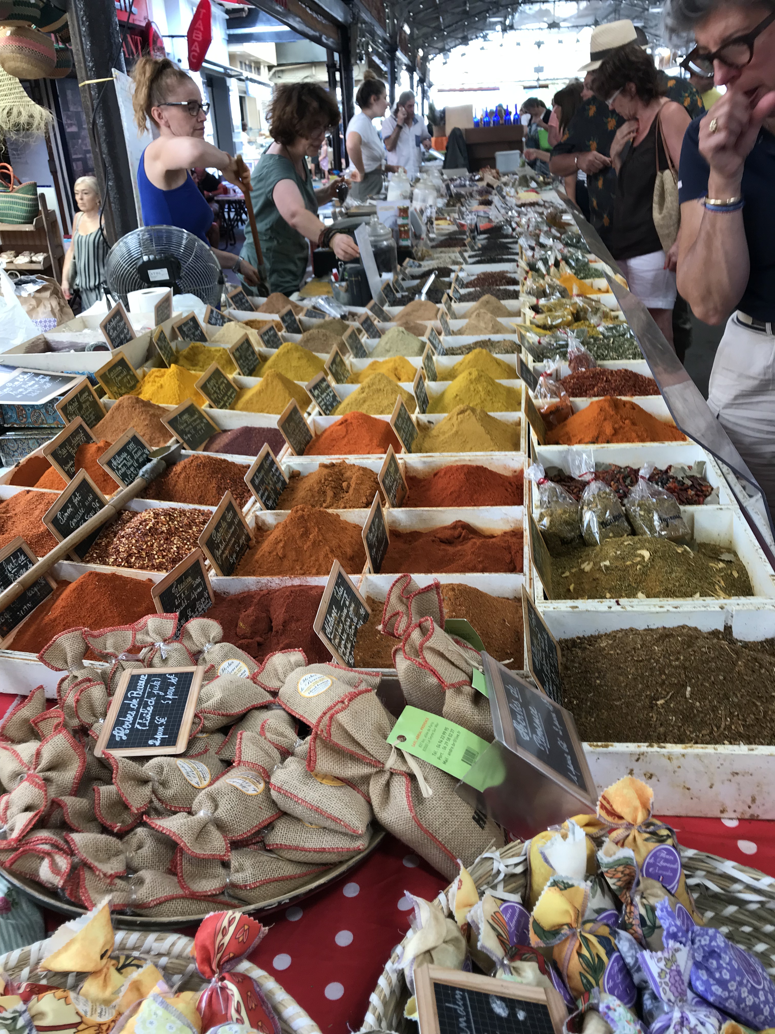 After lunch we drove to Biot, a little village in the hills behind Cannes. There is a large town car park, which was surprisingly full. Then we learned that we had happened to visit on the afternoon of the boules carrees championship, and teams were playing it in every street, and square, and lane. The game appeared to be the same as boule—when you throw little balls towards a target, and the closest wins—but it is played with small coloured cubes (the kind you built towers with as a toddler). Teams were all ages, but the games were pretty intense, and there was a lot of pressure to not, by mistake, walk across the area where they were playing (which as they were playing everywhere was sometimes quite hard!)