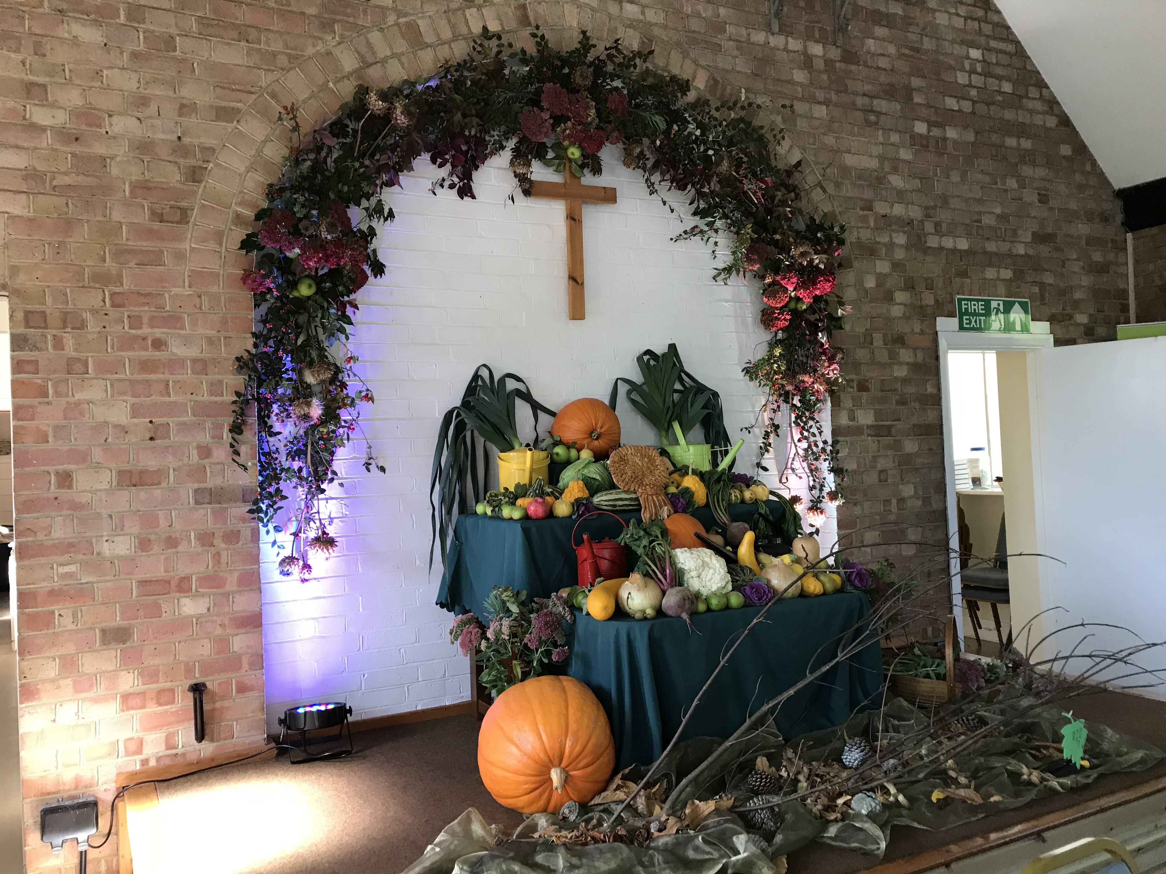Friday evening: Popped into church to check: kitchen was clean, there was a supply of toilet rolls, I filled freezer with ice-creams. The stage was heaped with beautiful flowers and vegetables which people had grown and donated.