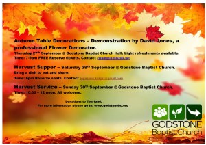 July: We finalised the design for the fliers, setting the times for when we thought the most people would be able to attend (needed to juggle people who work on Saturdays with those families who are on an early clock). J told us the ‘thank you tree’ was under control, and she had ordered some rather smart autumn leaves. We discussed whether to have a flower demo followed by a workshop, or whether to split that over two evenings. We then realised we were suggesting people came Thursday, Friday, Saturday and Sunday to harvest events, and this might be too much for most people. Decided to drop the Friday workshop, and instead decorate the church Saturday morning.