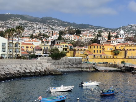 Our last stop was Praia da Calheta. This was a busy town, full of people, cars trying to park, cafes and supermarkets. There was a small marina, with little boats bobbing in rows, and a long promenade with palm trees and cafes. There were also beaches, with yellow sand hauled from Africa. Despite the cold, several teenagers were swimming, their squeals piercing the air. Steep cliffs bordered the coastal road, and we sat in a cafe, sipping espresso and watching little black and white birds nesting in the rock while seagulls swept past looking for food.