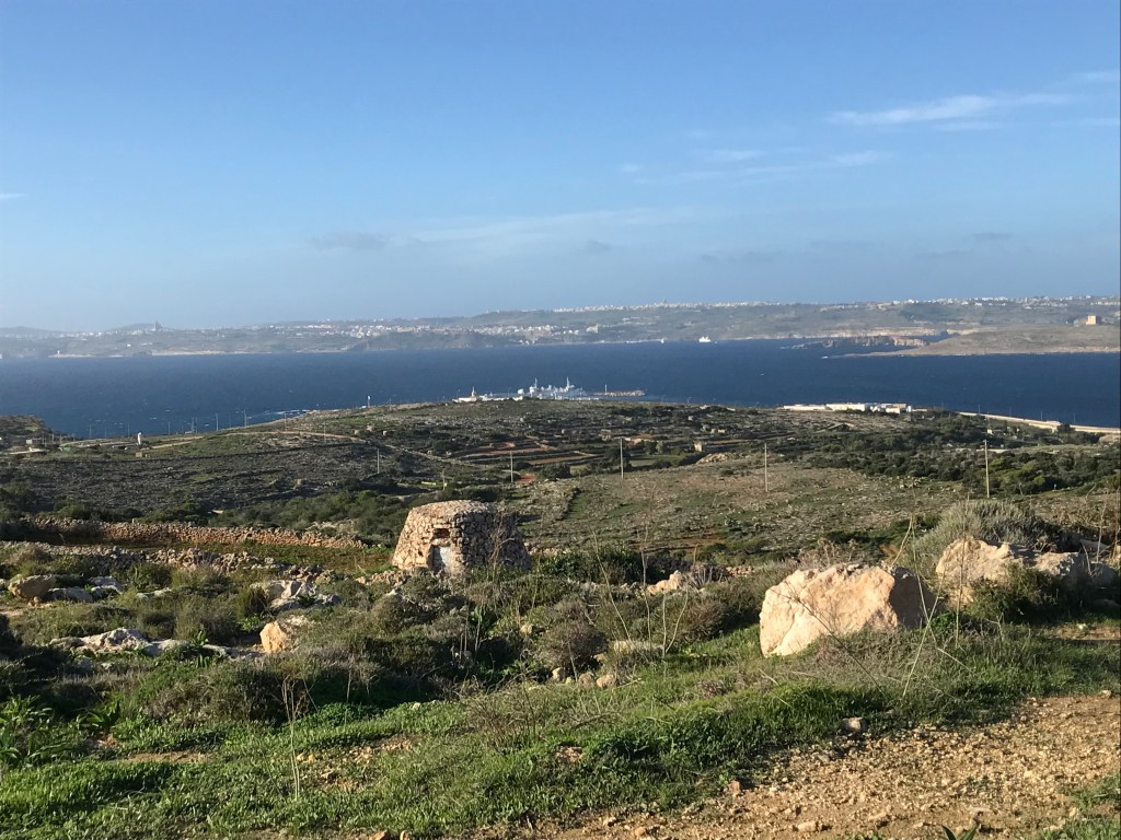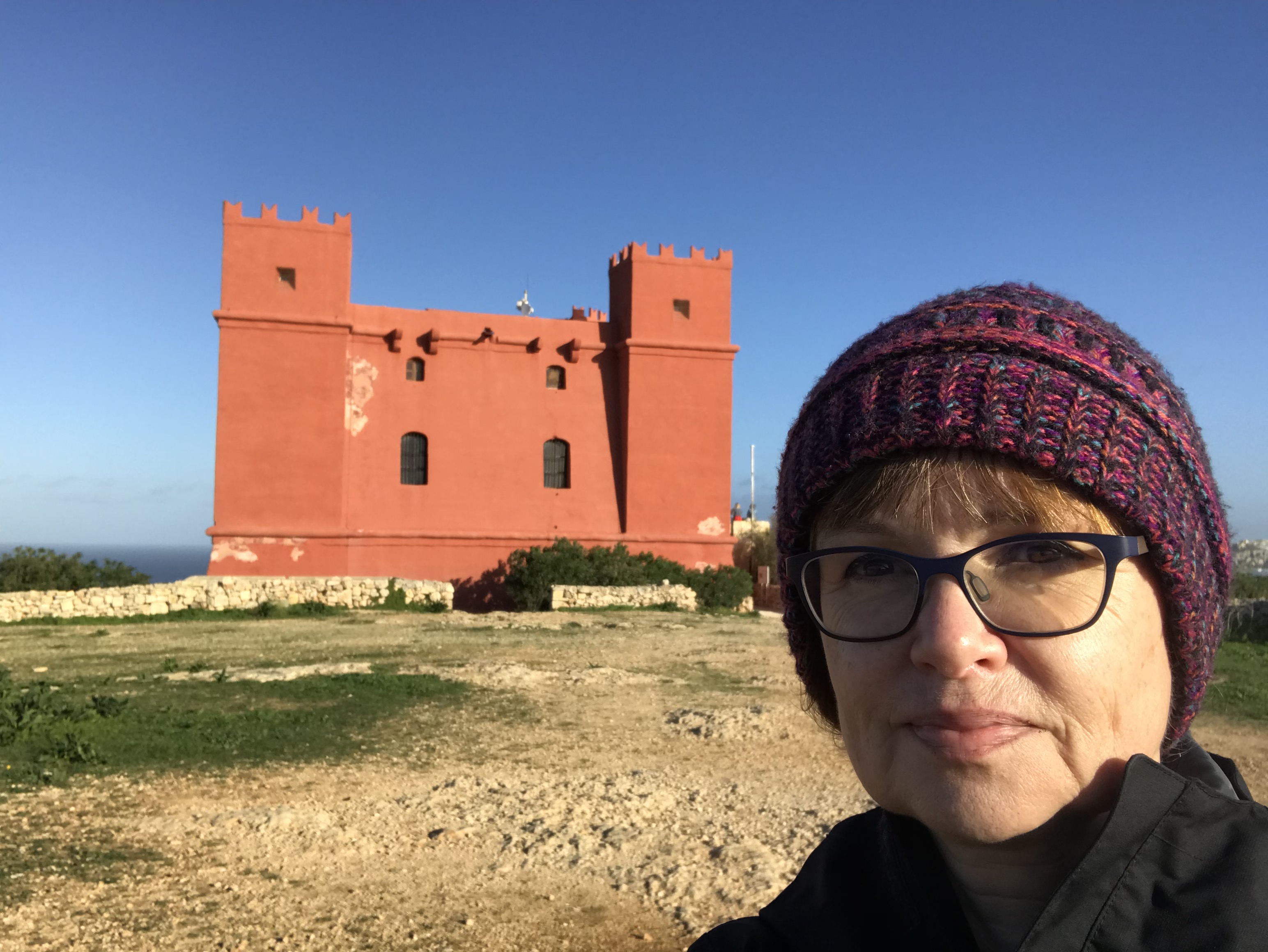 Drove towards a red fort, which looked exciting from a distance but more like a public loo when we arrived. We could also see a pyramid, far away in the distance. We worked out it was on Gozo, but there was NOT a pyramid on Gozo, so we were confused. Husband stopped for a walk (not my choice) and we strolled across scrubby land towards a tower. Malta is full of towers. Some are beautiful, some are imposing, this was neither.