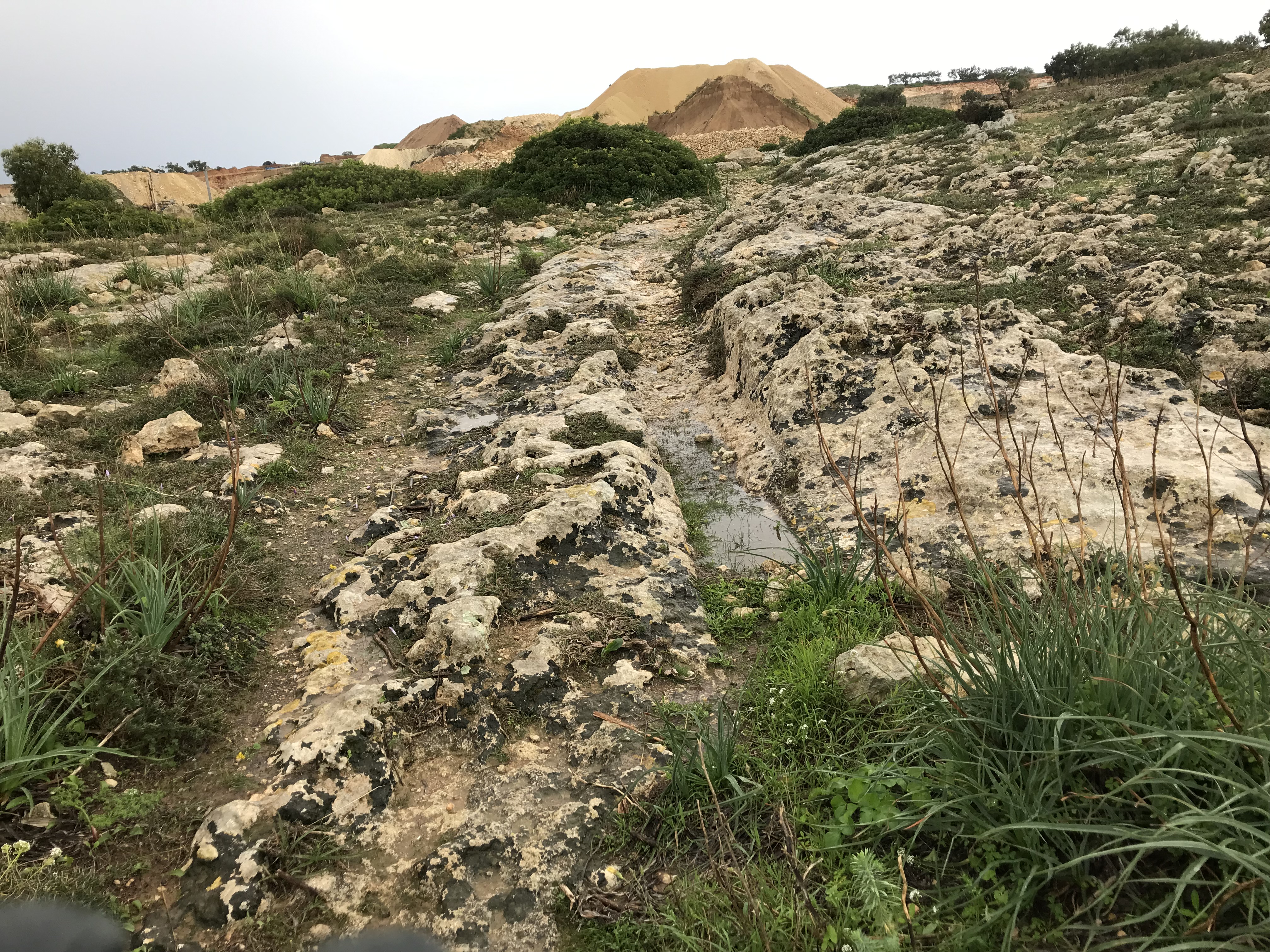 After lunch, we walked quickly to the car park and collected the car. We drove to ‘Clapham Junction’ which is so named because there are lines of cart tracks in the rock. No one knows exactly when the tracks were made — some people date them back as early as the Phoenicians — at least earlier than 700 BC. They are at a prehistoric site near Siġġiewi. We parked (no signs, so needed to follow Google maps) and started to walk towards where we thought they might be. But then it rained, so we hopped back into the car. Drove to a viewpoint on Dingli Cliffs (basically all grey and windy). The rain stopped, so we drove back to look at the tracks. It took us a while to find them, but once we had seen them, and realised what we were looking for, they were easy to see — very deep grooves worn into the limestone. They were much deeper than I was expecting.