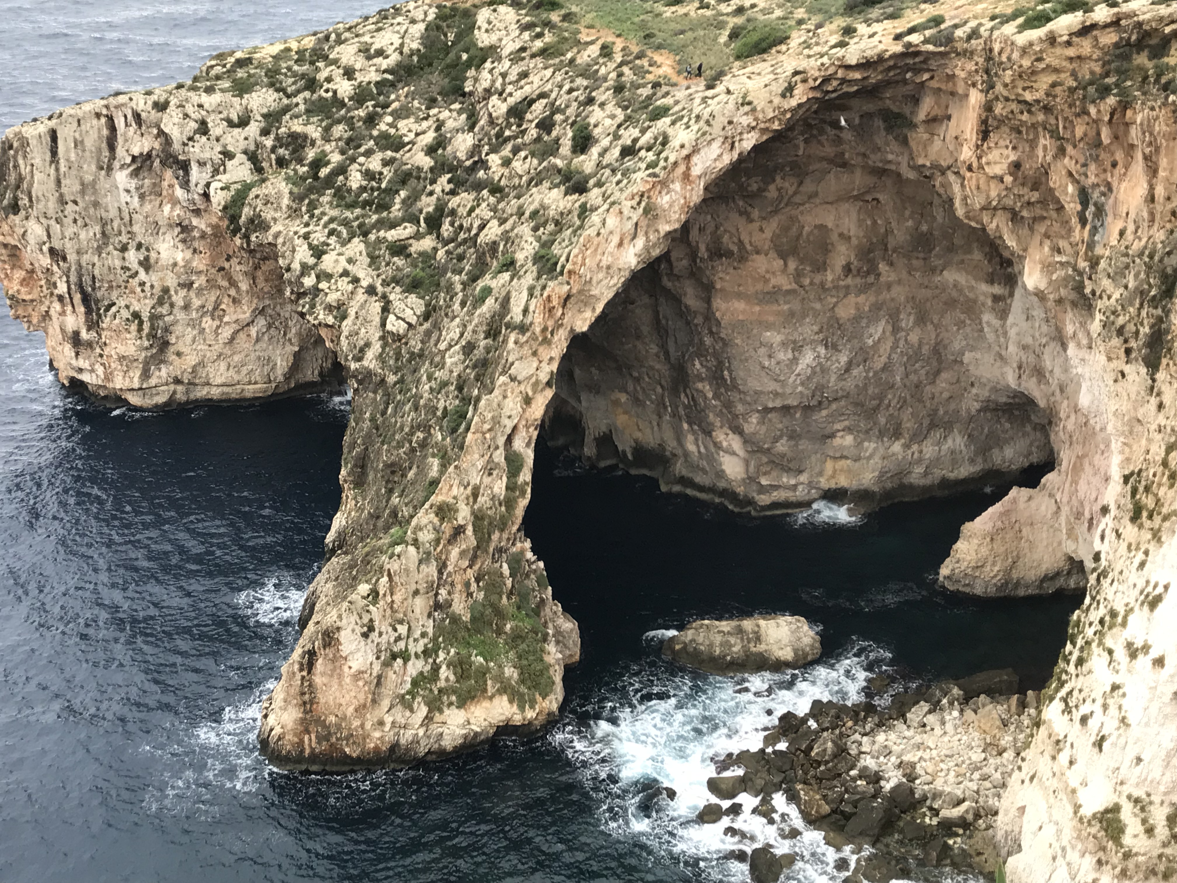 Next, we drove to the Blue Grotto. There was a parking area, and a pathway along the cliff edge to a viewpoint. I spent a long time looking at a pretty cove and taking photographs. Husband then told me this was not the grotto, and directed me round the corner. The grotto was spectacular — much better than the pretty cove!