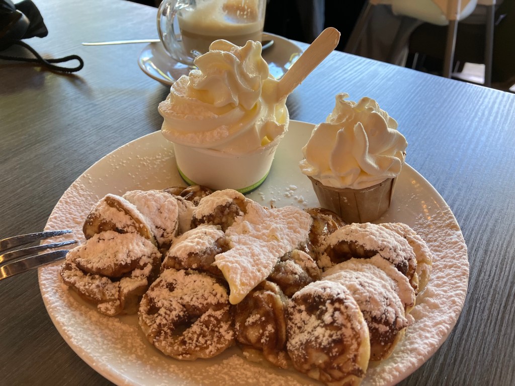 Aaahhh, the lounge. We sat at a table and ordered food and drink. Husband went to the washroom so I selected a newspaper and sipped coffee until he returned. Life was comfy. I ordered a grapefruit (nice and sweet, didn’t need the small pot of Demerara sugar). The Eggs Florentine (a single muffin half, which is perfect for me, with thick salmon, a poached egg blanketed in low-cholesterol-diet-busting hollandaise sauce). I finished with a ‘croffle’ which turned out to be a croissant pastry cooked in a waffle iron—which only half worked (very tasty but a bit too chewy) topped with fruit compote and coconut yogurt. Not a bad start to the day.