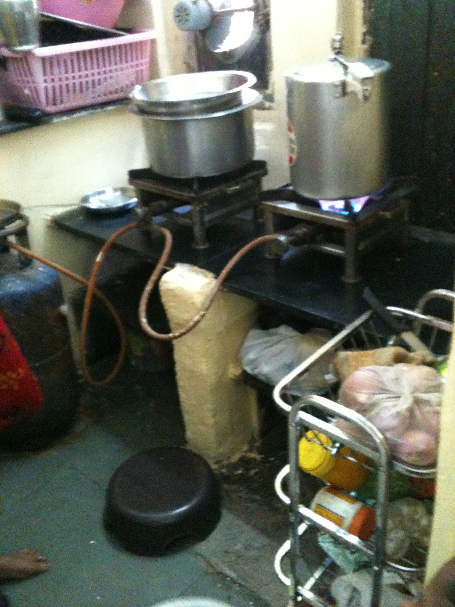 There was a bowl of hard boiled eggs, which they must’ve cooked earlier. No worksurface (no idea how they chop vegetables – they must do it in their hand, on a plate balanced somewhere). No sink, no running water. There were cupboards, some of them very high. At one point a woman climbed, a foot on a shelf, other foot on the top of a cupboard door, to reach plates from a top cupboard. Metal plates were stacked on a drainer.